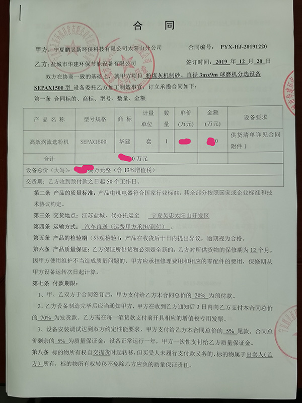 我司三年后與老客戶寧夏鵬昱新環(huán)??萍加邢薰驹俅魏献魑宜拘滦透咝u流選粉機(jī)SEPAX1500型,配套直徑3.0米球磨機(jī)使用。