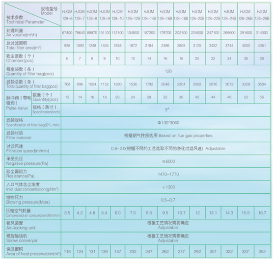 2、表中的處理風(fēng)量是按過(guò)濾風(fēng)速為1.2m/min計(jì)算得出的,僅供用塵源點(diǎn)的含塵濃度小于30g/Nm3和過(guò)濾風(fēng)速不祥的情況下,直接按表中所標(biāo)注的處理風(fēng)量進(jìn)行選型之用。